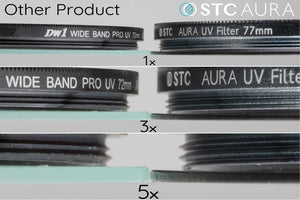 秉持創新與實用的研發精神,STC再度領先業界,推出僅有0.8mm厚的超低光程差 (Super-low Optical Path Difference)保護鏡-「AURA高細節UV保護鏡」,採用全新次世代製程強化陶瓷玻璃,比大金剛玻璃保護鏡薄了近30%,僅0.8mm卻同樣有700MPa強度,實驗使用45g高爾夫球於2.5米高空砸落仍不碎裂!0.8mm高透光(平均透光率99.5%)高硬度全光譜穿透設計,有效減少玻璃內部光學繞射問題,可為您的鏡頭達到最佳的保護。
